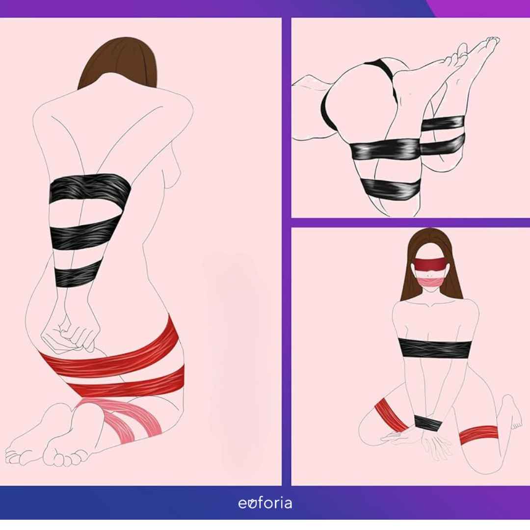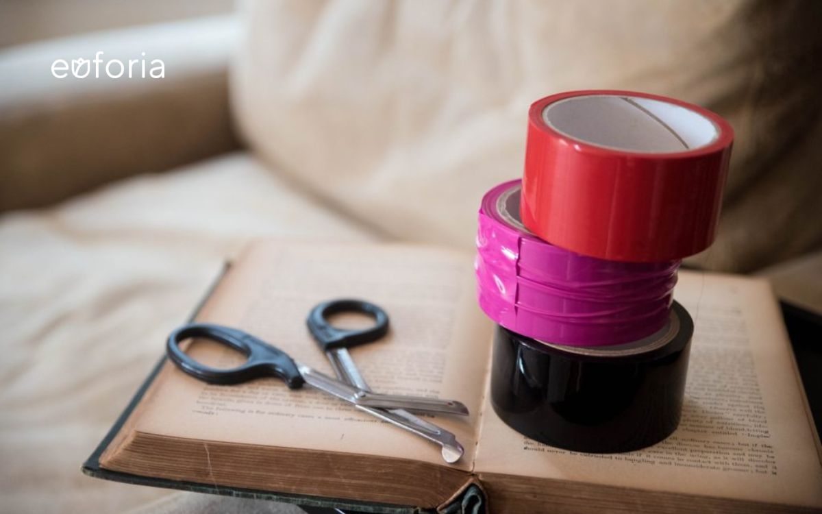 Thay vì dùng dây trói thì các cặp đôi có thể dùng băng dính bạo dâm là công cụ. Bạn có thể quấn toàn thân bạn tình bằng băng keo BDSM và chừa 1 lỗ để thở để roleplay "xác ướp", hoặc đơn giản là dùng trói chân, tay "người phục tùng" rồi sử dụng máy rung rê nhẹ lên cơ thể để tạo cảm giác hưng phấn, kích thích khi nhìn đối phương bứt rứt "xin tha". Cảm giác bị quấn băng dính lại, sau đó giật mạnh ra sẽ cực "phê" chứ không hề bị rát. Bạn sẽ mê mệt nếu bạn tình kết hợp băng dính BDSM với nhiều món đồ chơi bạo dâm khác như kẹp ti, nến BDSM, hoặc chỉ cần combo roi da và tape là đủ để Dom và Sub có một cuộc chơi đầy tình thú.